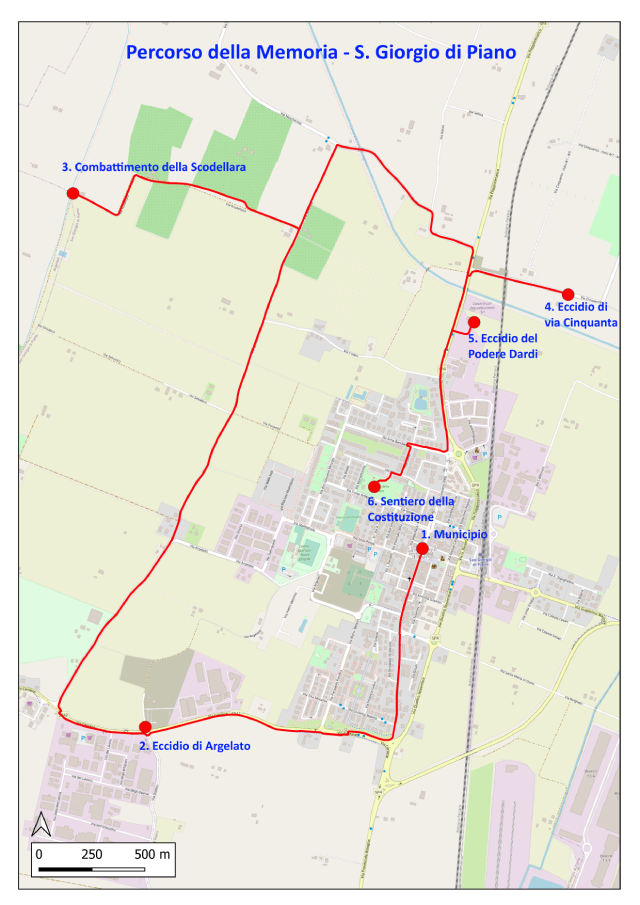 Questo percorso idealmente inizia dal Municipio, dove sono collocate le lapidi dedicate ai caduti di San Giorgio, per poi toccare i luoghi degli eccidi, delle fucilazioni di prigionieri, delle battaglie partigiane, delle uccisioni di civili per rappresaglia, per concludersi, all’interno del Parco della Pace, nel Sentiero dedicato a quello che è stato il risultato tangibile e duraturo della guerra partigiana in Italia, cioè la Costituzione.
