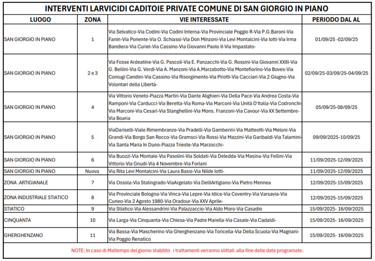 Gli interventi saranno realizzati da una squadra di 2 operatori, per un totale di 3 interventi, mentre per i periodi tra un intervento programmato e l’altro sarà fornito ai cittadini un kit per eseguire il trattamento in autonomia. Questi interventi saranno condotti nelle aree private dei centri abitati a partire dalle seguenti date: